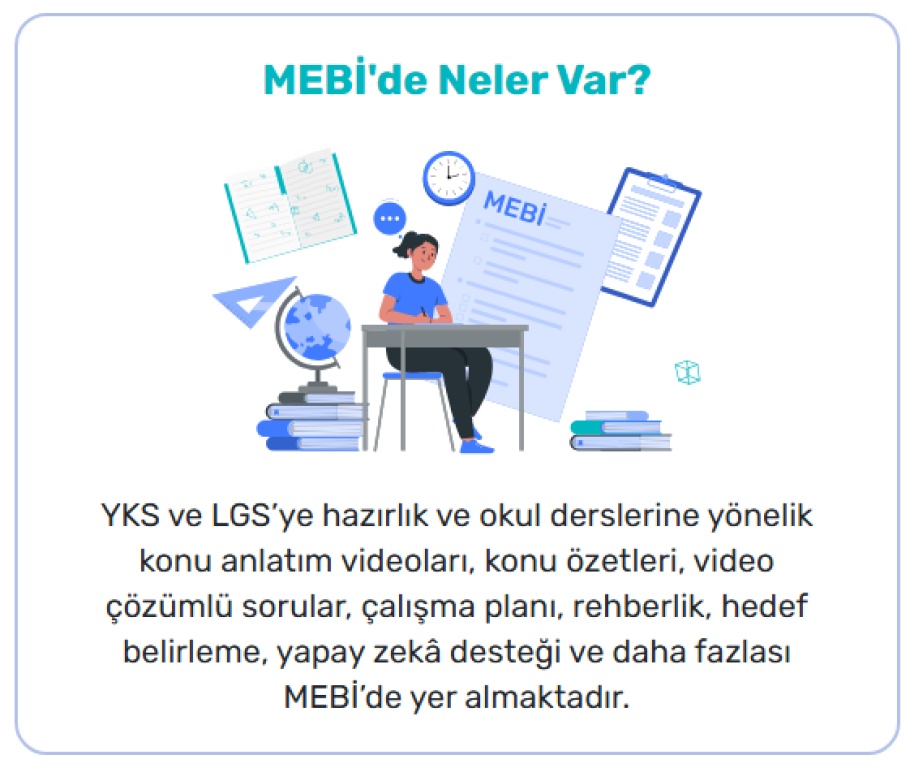 YKS’ye hazırlık ve okul derslerine yönelik konu anlatım videoları, konu özetleri, video çözümlü sorular, çalışma planı, rehberlik, hedef belirleme, yapay zekâ desteği ve daha fazlası MEBİ’de yer almaktadır.