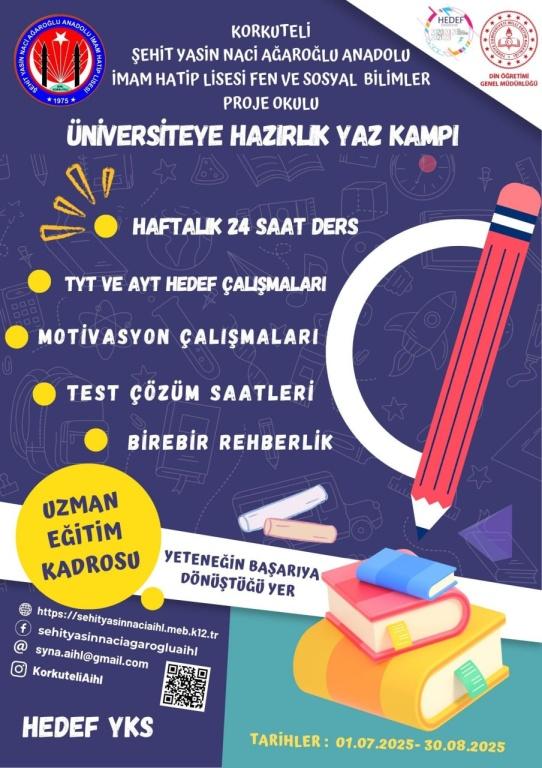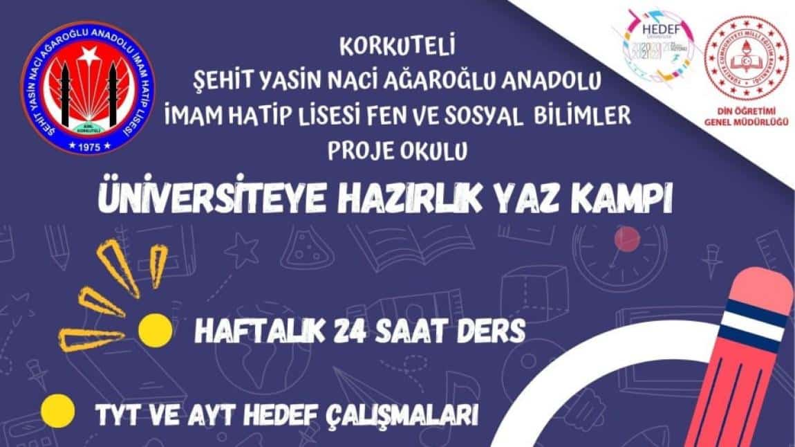 Üniversiteye hazırlık çalışmaları kampsamında 1 Temmuz - 30 Ağustos tarihleri arasında okulumuzda üniversiteye hazırlık yaz kampı düzenlenecektir.